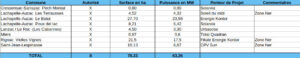 De plus, notre recensement des projets photovoltaïques au sol établi à partir des éléments publiés par les services de la préfecture du Lot (voir tableaux ci-dessous), nous a permis d’identifier (en plus des deux projets cités plus haut) 8 projets déjà autorisés, 10 projets en instruction (demande de permis de construire déjà déposée) et 12 projets à l’étude en concertation avec la DDT (sans compter les projets en prospection connus de celle-ci). Quant aux parcs déjà en fonctionnement, ils sont au nombre de 6. Parmi ces projets et installations, 227 ha se trouvent en zone Ner. Il reste donc 490 ha d’espaces naturels classés zone Ner donc dédiés à la production d’énergie renouvelable. Autrement dit les propos du conseiller communautaire qui se voulaient « rassurants » n’apparaissent en rien réalistes.