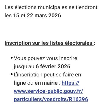 Par un court communiqué via l’application Intramuros, la mairie de Gignac nous rappelle que les prochaines élections municipales se dérouleront les 15 et 22 mars prochain et nous précise les modalités d’inscription sur les listes électorales.