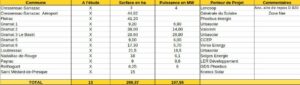 De plus, notre recensement des projets établi à partir de sources officielles (voir tableaux ci-dessous), nous a permis d’identifier (en plus des deux projets cités plus haut) 8 projets déjà autorisés, 10 projets en instruction (demande de permis de construire déjà déposée) et 12 projets à l’étude (sans compter les projets en prospection connus de la DDT). Quant aux parcs déjà en fonctionnement, ils sont au nombre de 6. Parmi ces projets et installations, 227 ha se trouvent en zone Ner. Il reste donc 490 ha d’espaces naturels classés zone Ner donc qui seront prioritairement dédiés à des installations photovoltaïques. Autrement dit les propos du conseiller communautaire qui se voulaient « rassurants » n’apparaissent en rien réalistes.